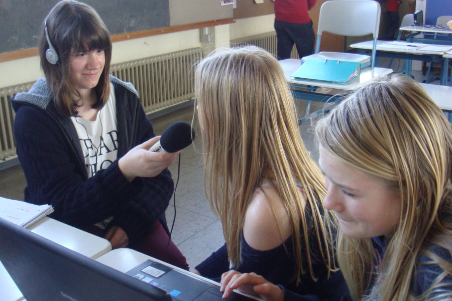 Daraufhin durften die Schüler selbst aktiv werden. Es ging auf den Schulhof und in die Umgebung, wo es galt, interessante O-Töne zu sammeln. Auch wenn die Schüler dabei keine Berührungsängste zeigten, so hatten sie doch ihre Schwierigkeiten. So kann es auch schwer fallen, aus sehr vielen Aussagen die richtigen herauszupicken. Abschließend mussten die Aussagen geschnitten und Texte geschrieben und eingesprochen werden, bevor die fertigen Beiträge gemeinsam angehört werden konnten.