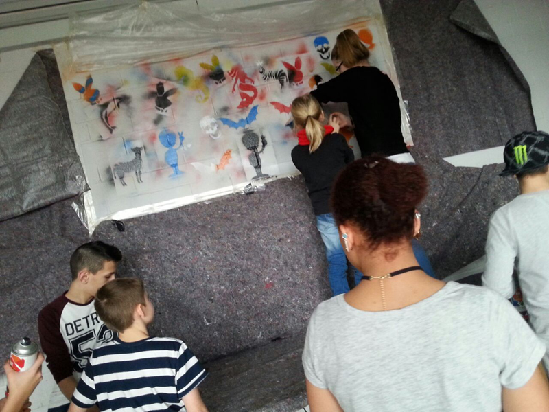 Janine und Andreea, die beiden KulturStarterinnen der Schwarzwaldschule Rheinstetten führten mit SchülerInnnen der sechsten Klasse einen Graffiti-Workshop durch. Erfahrungen und Kenntnisse, die sie als Teilnehmerinnen im Graffiti-Workshop im Rahmen ihrer KulturStarter- Ausbildung im Oktober gemacht hatten, konnten sie an die jüngeren SchülerInnen weitergeben. Sie vermittelten Grundlagen über Sprühkunst, zeigten wie man Schablonen entwirft und wie ein Graffiti entsteht. Gemeinsam gestalteten die SchülerInnen mit den KulturStarterinnen so eine Wand in ihrer Schule neu.