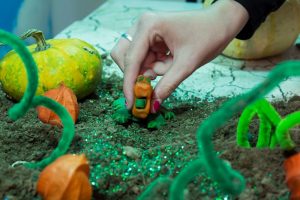 Am zweiten Tag verfeinerten alle drei Gruppen ihre Ideen, überlegten sich Geschichten und arbeiteten an verschiedenen Orten an ihren Filmen. Mit Hilfe der Stop Motion Technik wurden Menschen, Gebasteltes oder Lego-Figuren animiert. Der Vor- und Nachmittag ging schnell vorüber. Die Pixilation-Gruppe hatte am Schluss bereits alle Aufnahmen in der Turnhalle im Kasten, die Lego-Gruppe hatte etwa die Hälfte ihrer Geschichte animiert und die Bastel-Gruppe hat den ganzen Tag fleißig gebastelt, geknetet, gegärtnert und Origamiblumen entworfen sowie mit Hilfe von Herbstdeko der Schule einen Zauberwald erstellt. Sie verschoben nach so viel kreativer Arbeit die Animation auf den nächsten Tag.