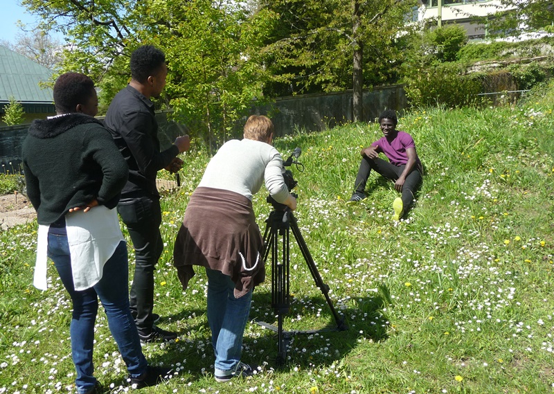 Ein bewegendes und intensives Projekt erlebte die komplette VAB-O-Klasse der Justus-von-Liebig-Schule in Waldshut. 15 Schülerinnen und Schüler aus Syrien und Afrika im Alter von 17 bis 32 Jahren stellten sich der Aufgabe, im Rahmen des zweiten Pilotprojekts für junge Flüchtlinge an ihren Bewerbungsvideos zu arbeiten. Die Teilnehmenden verfügten bereits alle über eine schulische Ausbildung, hatten zum Teil Abitur, in ihrer Heimat bereits ein Studium begonnen oder schon mehrere Jahre in einem Beruf gearbeitet. Vor Beginn des Projekts hatten sie außerdem alle ein Berufspraktikum absolviert und konnten deshalb ihr Augenmerk vor allem darauf richten, ihre Sprachkenntnisse zu verbessern und sich darauf vorzubereiten, wie ein Bewerbungsgespräch in Deutschland abläuft. Mit viel Motivation übten sie zunächst das Sprechen, Aussprache und Betonung ihrer Texte und machten sich dann voller Ehrgeiz an die Tonaufnahmen. Bei den Dreharbeiten am dritten Workshoptag wurden dann unter anderem zwei Teilnehmer an ihrem Praktikumsplatz in der Autowerkstatt und im Altenheim gefilmt, einer auch beim Fußballtraining. Die Referentinnen des Projekts mussten während des Projekts zwar gelegentlich kleinere Zwistigkeiten unter den Gruppenmitgliedern entschärfen, beobachteten aber auch eine große Energie, Motivation und Begeisterung bei allen Beteiligten. Dass die Klasse auch als Projektgruppe gut funktionierte, bewies nicht zuletzt das gemeinsame Zubereiten und Verspeisen von syrischen und afrikanischen Speisen, bei dem alle viel Spaß hatten.