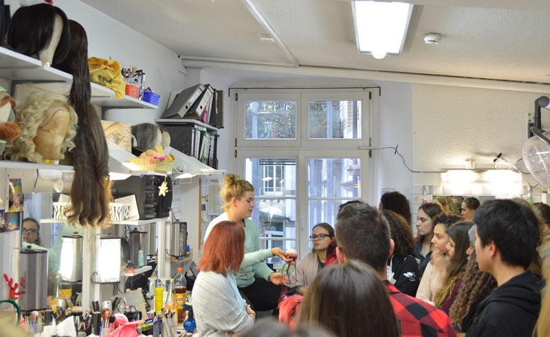 Die Leiterin des Jungen Theaters und der Referent des Intendanten empfingen die Jugendlichen im Foyer des Theaters und führten sie anschließend durch die Räumlichkeiten, wie den Malsaal, die Maske, die diversen Stofflager, die Hauptbühne sowie die eigene Schlosserei des Theaters. Besonders beeindruckt waren die Jugendlichen von den persönlichen Erfahrungsberichten der Theatermitarbeiter vor Ort, die den Jugendlichen Informationen und Einblicke in ihre alltägliche Arbeit geben konnten. So kamen auch die verschiedenen Berufe am Theater zur Sprache und weckten das Interesse der Jugendlichen.
