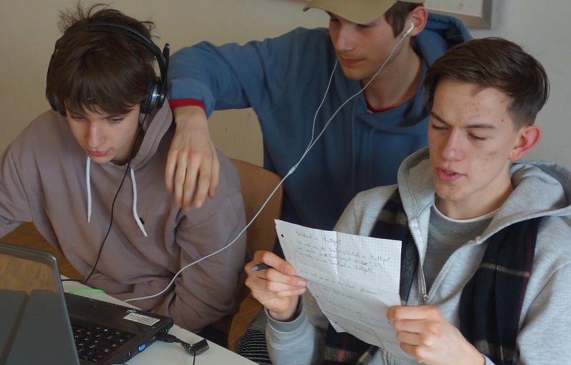 Jungs beim SChneiden und Lesen - BlogFür die 9.- bis 11.-Klässler der Freien Waldorfschule am Kräherwald in Stuttgart war der Radio-Workshop ein Wahlpflichtfach, von denen sie zwei pro Schuljahr absolvieren müssen. Er diente den Schüler*innen auch als Vorbereitung für die Bildungsmesse „didacta“, auf der sie im Februar 2017 täglich zwei Audio-Beiträge zu Themen der Messe produzierten und über die Messe berichteten.