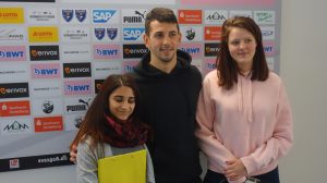 Im Vorfeld hatte die Schule selbst schon für Interviewpartner gesorgt. Ein Treffen für ein Interview mit Spielern des SV war bereits organisiert. Der Verein hatte dafür sogar groß seinen Presseraum zur Verfügung gestellt, die Spieler hatten Namensschilder auf dem Podium –es herrschte also etwas Bundesligaflair, durch das sich die Schüler*innen auch wertgeschätzt fühlten.