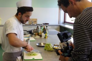 So konnten unterschiedlichste Szenen gedreht werden: vom Umgang mit einem Plasmaschweißgerät, von der Kreation eines neuen Gerichts, vom Verbinden eines „verstauchten“ Handgelenks oder auch von Laborarbeiten. Wichtig war es dem LKJ-Team, gemeinsam mit den jungen Erwachsenen die richtigen Bilder zu finden und zu drehen.