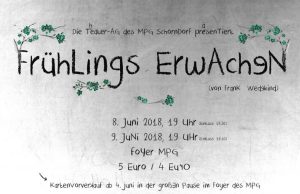 An 8. und 9. Juni, jeweils ab 19 Uhr, findet am Max-Planck-Gymnasium in Schorndorf die alljährliche Theateraufführung statt. Die Theatertruppe führt das Stück „Frühlingserwachen“ von Franz Wedekind auf. 24 theaterbegeisterte Schüler*innen und zwei sehr engagierte Lehrer*innen proben seit Monaten an diesem Stück und freuen sich über zahlreiche Besucher*innen. Beteiligt, sowohl als Schauspieler*innen oder Techniker*innen sind KulturStarter aus verschiedenen Jahrgängen und wir wünschen allen ToiToiToi!