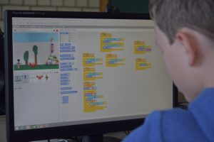 Für den weiteren Projektverlauf wurde die Gruppe nochmals halbiert, sodass in der Kreativwerkstatt eine Hälfte konzentriert Geschichten erfinden, Storyboards zeichnen und Elemente wie Figuren oder Hintergründe aus Knete oder Lego bauen konnte. Im Computerraum konnte sich dann die andere Hälfte mit dem Programm Scratch vertraut machen und Schritt für Schritt die Idee eines eigenen Medienkunstwerkes realisieren konnte.