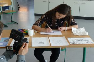 Nach einer kleinen Vorstellungsrunde und theaterpädagogischen Aufwärmübungen für Stimme und Körper begannen schon die ersten Ton- und Bildaufnahmen. Das selbstbewusste Sprechen vor der Kamera fiel einigen zu Beginn verständlicherweise noch nicht so leicht. Hervorzuheben ist, dass gerade die drei Teilnehmer*innen, welche mit ihren Familien erst in den letzten Jahren nach Deutschland gekommen waren, im Laufe der Projekttage große Fortschritte in ihrem Auftreten machten.