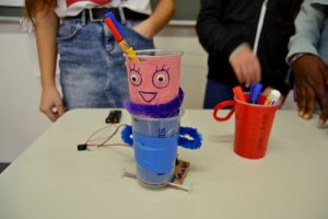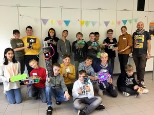 bauen dürfen. Mit viel Phantasie, dem Neuerlernten und etwas Unterstützung unserer Referent*innen werden erst Skizzen und Schaltpläne erstellt. Im Anschluss werden die recycelten Einzelteile, mit Kabeln, Motoren und LED’s verbaut, verlötet und verklebt bis die Erfindungen Gestalt annehmen. Dabei geht es nicht nur um die Funktionen der Miniroboter, sondern natürlich auch ums Basteln, Tüfteln, Personalisieren und Verzieren.