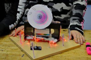 Seit September 2019 bietet die Landesvereinigung Kulturelle Jugendbildung Baden-Württemberg gefördert durch die Landesanstalt für Kommunikation ein neues Medienprojekt unter dem Namen „MakerBox“ an. Wir bringen Making an die Schulen. Innerhalb von zwei Projekttagen lernen Schüler*innen der 4.-6. Klassenstufe nicht nur die Begriffe Strom und Spannung kennen, welche Einzelteile sich in alten Elektrogeräten befinden und wie man diese wiederverwenden kann, sondern bauen auch ihre eigene kleine Kunstmaschinen. Die Kombination der beiden Ebenen Gestaltung und technikbasierte Medienarbeit ermöglicht eine individuelle Schwerpunktsetzung und erleichtert somit den Einstieg unabhängig des Vorwissens der Teilnehmenden. Dass hier Kreativität mit technischem Tüfteln verbunden wird, kann man an den tollen Ergebnissen sehen, die während der letzten vier Projekte entstanden sind.
