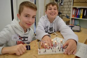 Zwei Tage verbringt das LKJ-Mediereferent*innenteam mit einer Gruppe – meist in einem der Kunst- oder Technikräume. Die Teilnehmenden erhalten am ersten Tag eine kurze aber wichtige Sicherheitseinweisung und lernen beim Experimentieren Begriffe rund ums Thema kennen – wie Strom, Wiederstand und Spannung. Das Neuerlernte wird im Anschluss in kleinen Versuchen am Steckbrett erfahrbar gemacht. Schaltkreise werden gesteckt (Parallel- und Reihenschaltung), Strom zum Fließen und Glühbirnchen zum Leuchten gebracht.