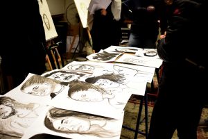 Der zweite Seminartag war ausschließlich von der Kreativität der Teilnehmenden bestimmt. Im Werkstatthaus Stuttgart konnten die KulturStarter einen von fünf künstlerischen Workshops besuchen. Im Malereiatelier unter dem Dach portraitierten sich die Jugendlichen gegenseitig mit Tusche. Dabei stand vor allem das genaue Beobachten im Vordergrund, es entstanden über vierzig stilistisch einzigartige Bilder, die mithilfe des Siebdruckverfahrens farbenfroh vervielfältigt und abends dann bei einer Mini-Ausstellung den anderen KulturStartern präsentiert wurden.