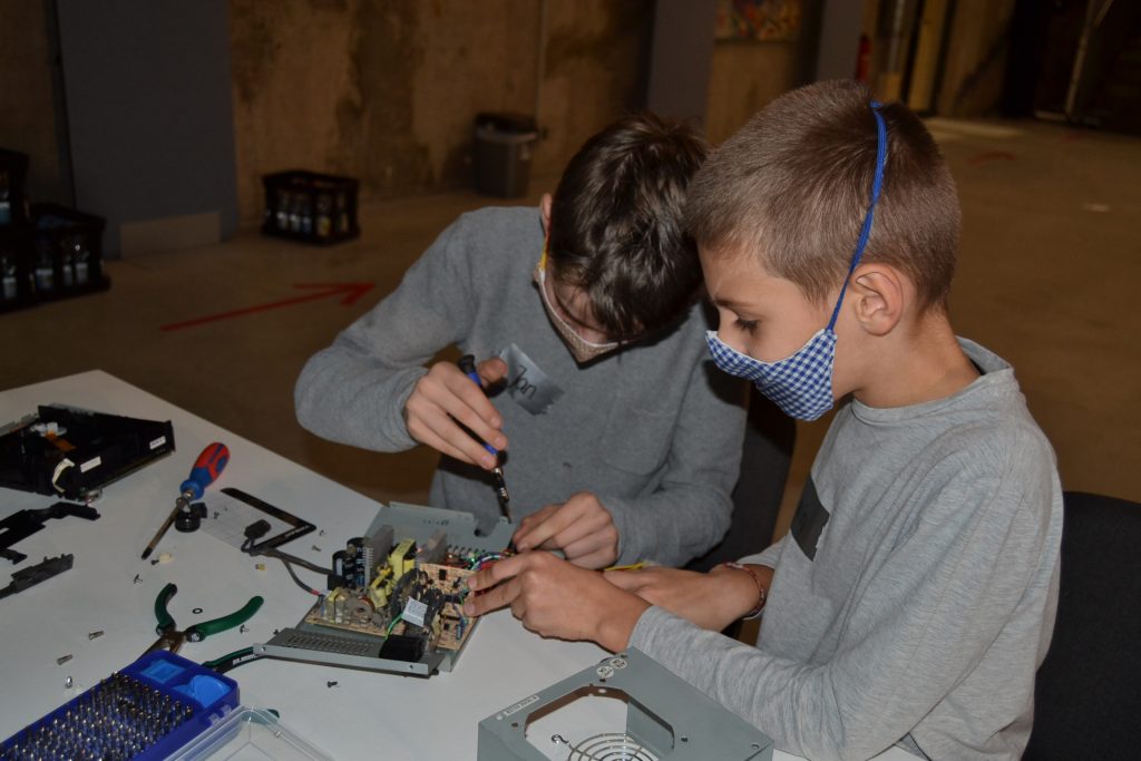 Das MakerBox Projekt im Hubwerk01 in Bruchsal war eine kleine Premiere, weil es zum ersten Mal in einer anderen Umgebung als der Schule durchgeführt wurde. Das ehemalige Siemensgebäude wurde umfunktioniert und dient seither als Maker-und Eventspace. Trotz Herbstferien kam eine Gruppe von 16 Schüler*innen zusammen, um kreativ zu arbeiten, zu erfinden und zu tüfteln. Nach einer ersten Kennenlernrunde zeigten die Jugendlichen durch ein Standogramm (ihre jeweilige Positionierung im Raum), welche Maker-Erfahrungen und Kenntnisse sie schon haben. Spätestens nach der Vorstellung des mitgebrachten Kunstroboters waren alle Projektteilnehmer*innen Feuer und Flamme und wollten ihren eigenen Roboter bauen. Daher widmeten sie sich eifrig dem Elektroschrott, auf der Suche nach widerverwendbaren Schätzen. Im weiteren Laufe des ersten Projekttages lernten die Schüler*innen nicht nur Begriffe wie Strom, Spannung und Wiederstand kennen, sondern bauten auch selbst Schaltkreise. Am zweiten Tag ging es dann ans Eingemachte. Die Schüler*innen erweckten ihre Ideen mit Lötkolben, Farbe und LEDs zum Leben. Nach und nach war in der Bauphase zu beobachten, wie sich die Ideen konkretisieren. Beim abschließenden Gallery Walk wurden alle Erfindungen gemeinsam vorgestellt und bejubelt.