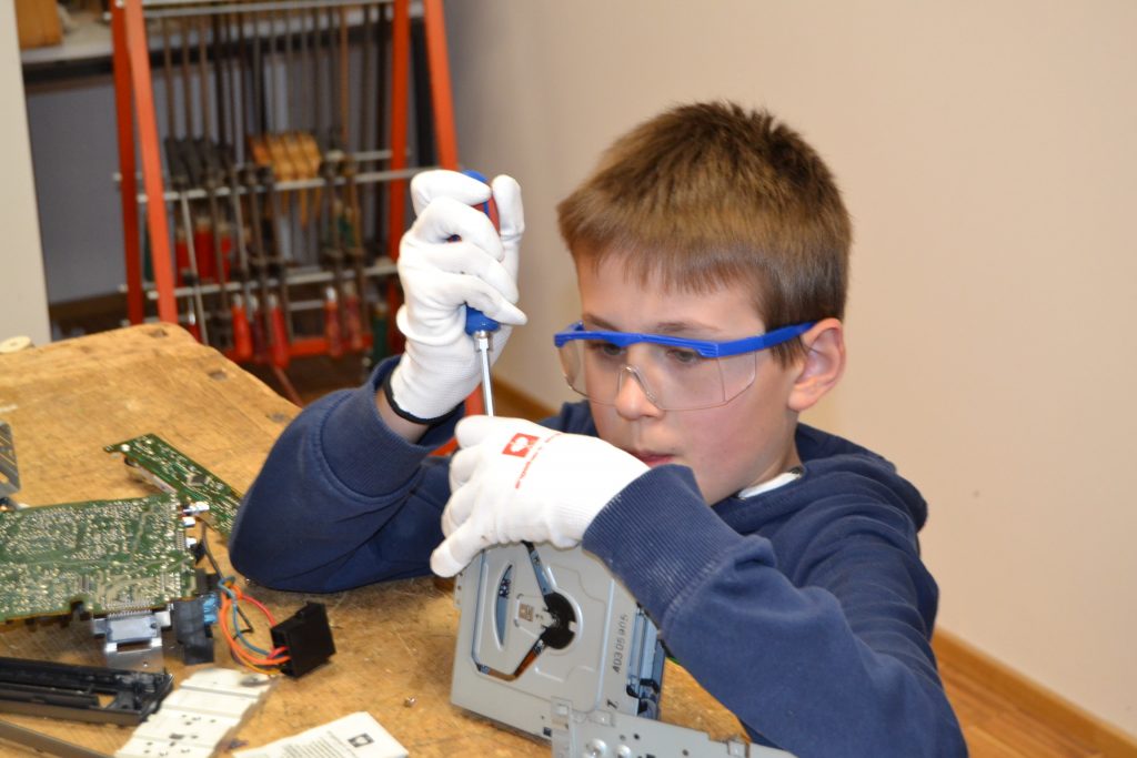 Die Kinder waren begeistert davon, Kunstroboter zu bauen aus alten Elektrogeräten und konnten es nicht abwarten, kreativ zu werden. Ausgerüstet mit Schutzbrillen und Handschuhen, Schraubenziehern, Zangen und weiterem Werkzeug wurde in Gruppen der mitgebrachte Elektroschrott untersucht und auseinandergenommen, darunter CD-Spieler, Drucker, alte Mobiltelefone, Laufwerke und viele weitere Geräte. So wurde das Material zügig in seine Einzelteile zerlegt. Am Ende dieser Phase sollten die Gruppen ihre Schätze sortieren und sich entscheiden, was wichtig für den Bau ihrer Roboter sein könnte. Nicht benötigtes Material sollte später im Gestaltungsprozess noch zur Verfügung stehen.