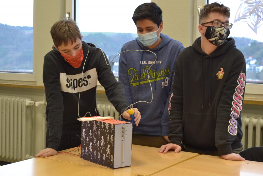 Und schon ging die Bauphase mit viel Eifer los! Es wurde gebaut, gelötet, gebastelt was das Zeug hält. Zusätzlich bekamen die Schüler*innen die Aufgabe, ihren Kunstmaschinen einen Namen zu geben. Die fertigen Kunstwerke wurden im Klassenraum gesammelt und ausgestellt. Gemeinsam begab sich die Gruppe zum Abschluss auf einen Gallerywalk und schauten jede Kunstmaschine gemeinsam an. Die Schüler*innen erzählten, wie sie ihre Roboter/Kunstwerke getauft haben und wie sie diese gebaut haben. Entstanden ist beispielsweise eine Katze die den Kopf rollen kann, ein sich drehender Weihnachtsbaum mit Beleuchtung, eine Diskomaschine und das Geschicklichkeitsspiel „Heißer Draht“, um nur ein paar der Kunstwerke zu nennen.