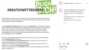 Nach Unterzeichnung des Vertrags und Rumtüfteln an einem geeigneten Flyer um die Aktion auszurufen, konnten wir die Kreativwettbewerbe starten. Da auch wir durch die Pandemie eingeschränkt waren, bewarben wir den Wettbewerb im Winter vor allem über den schuleigenen Instagram-Account und einige Fachlehrer*innen. Dies klappte einigermaßen gut, jedoch haben wir Rückmeldung bekommen, dass viele nicht von unserem Projekt erfahren haben, da die Schulen geschlossen waren.