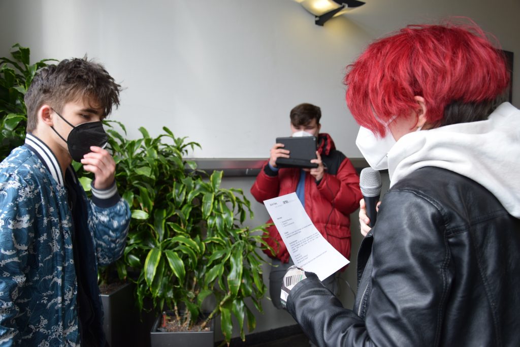 Der zweite Workshop-Tag begann mit der Einführung in die Medienpraxis und die Schüler*innen zeigten dabei bereits ein großes Vorwissen. In Dreiergruppen aufgeteilt, sollten sie dann Ideen für ihre ganz eigene Verschwörungserzählung sammeln und zunächst verschriftlichen. Im Anschluss ging es ans Filmen. Die Gruppen suchten sich für ihre Dreharbeiten passende Orte aus und setzten ihre Ideen um. Mit großem Engagement und hoher Konzentration erarbeiteten sie die einzelnen Szenen, kümmerten sich um fehlende Darsteller*innen für Zeug*innen oder Expert*innen und produzierten so Schritt für Schritt ihren Kurzfilm.