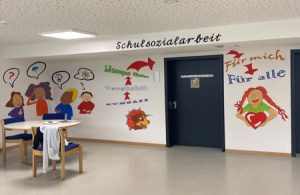 An die Pinsel, fertig, los! Die KulturStarter*innen der Tulla-Realschule in Karlsruhe wollten die Wand des Schulsozialarbeiters verschönern. Für dieses künstlerische Projekt, klärten sie zuerst die Rahmenbedingungen mit der Schulleitung ab und nach wenigen Gesprächen waren auch klar, die Materialien werden von der Kunstfachschaft der Schule gestellt.