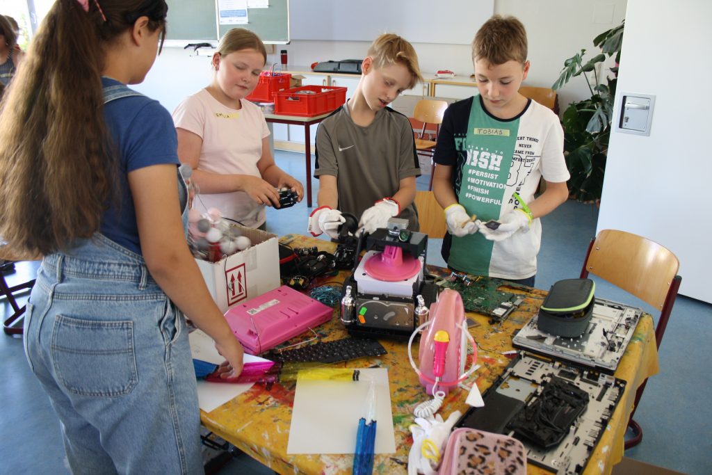 Die Schüler*innen waren fleißig, zeigten Interesse an den kleinsten Bauteilen und deren Funktionen und machten sich auch schon sehr zügig Gedanken über deren Kombination. Aufgrund unterschiedlicher Schwierigkeitsgrade beim Auseinanderbauen des mitgebrachten Elektroschrotts variierte auch die Schnelligkeit der Gruppen. Während die einen noch mit ihren Bauteilen kämpften, sinnierten die anderen schon intensiv über die potenziellen Fähigkeiten ihrer Roboter. Am Ende des ersten Tages hatten schließlich alle Gruppen schon ein gutes Repertoire an Bauteilen für den Roboterbau.
