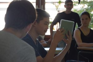 Am zweiten Tag entwickelte die Gruppe spontan noch mit zwei Filmteams jeweils zwei sehr unterschiedliche und spannende Fake News-Geschichten. Nachdem das grobe Skript samt Shotliste stand, wurden die verschiedenen Aufgaben aufgeteilt: wer steht nun vor der Kamera und wer bedient das iPad? Immer wieder mussten spontan verschiedene Dinge geklärt werden: wer sind unsere Statisten? wer spielt die Lehrkraft und wo können wir die Aufnahmen machen?