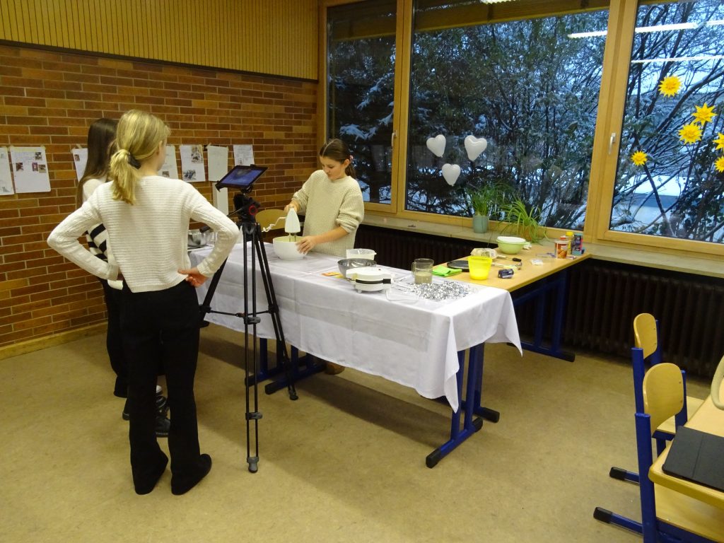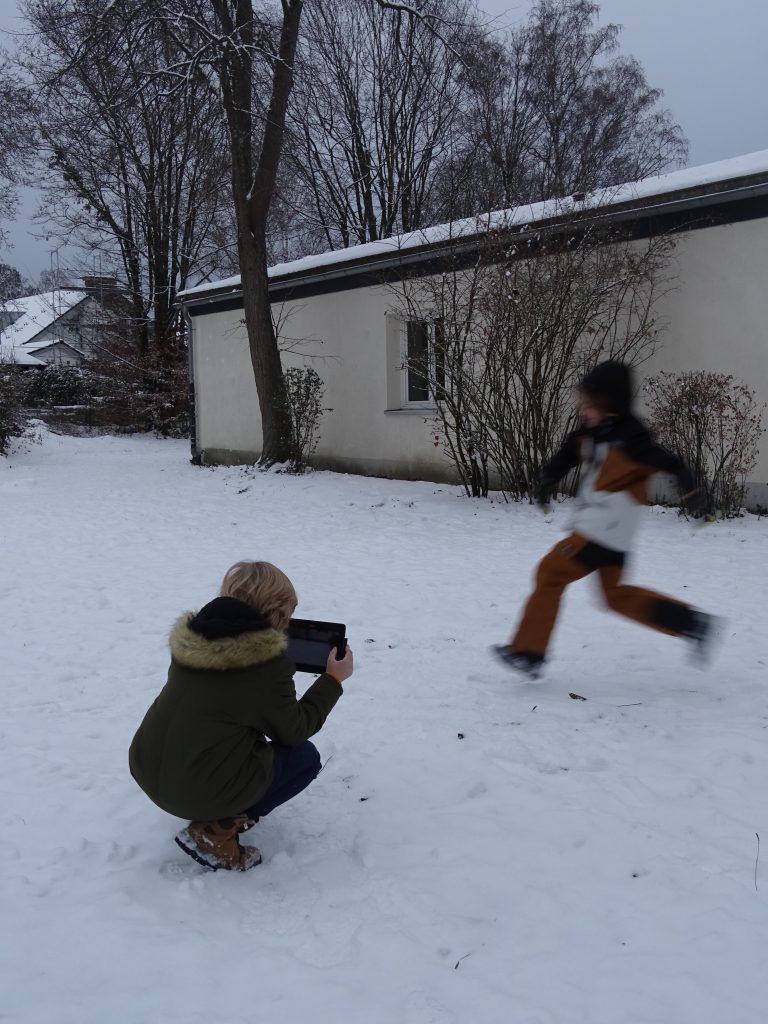 Der zweite Tag startete mit dem Drehen der Tutorials. Es stellte sich heraus, dass die Schüler*innen sich mit der Handhabung der iPads bereit sehr gut auskannten. Die Teilnehmenden wurden noch individuell in die Arbeit mit den verschiedenen Stativen eingewiesen und legten dann sofort eigenverantwortlich los. Einige Gruppen wählten für ihre Videos Themen aus, die einen Dreh im Freien erforderlich machten, andere blieben im Schulgebäude. Die Gruppen arbeiteten sehr selbstständig, sodass die Medienreferent*innen lediglich bei spezifischen Fragen zur Seite stehen mussten und Tipps zur Optimierung der Einstellungen gaben. So wurden am Ende des zweiten Tages alle Gruppen mit dem Filmen ihrer Videos fertig und hatten schon begonnen zu schneiden.