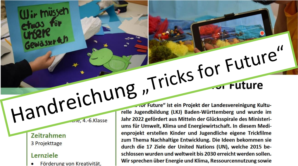 „Tricks for Future“ war ein Projekt der Landesvereinigung Kulturelle Jugendbildung (LKJ) Baden-Württemberg und wurde im Jahr 2022 gefördert aus Mitteln der Glücksspirale des Ministeriums für Umwelt, Klima und Energiewirtschaft. In diesem Medienprojekt erstellten Kinder und Jugendliche eigene Trickfilme zum Thema Nachhaltige Entwicklung.