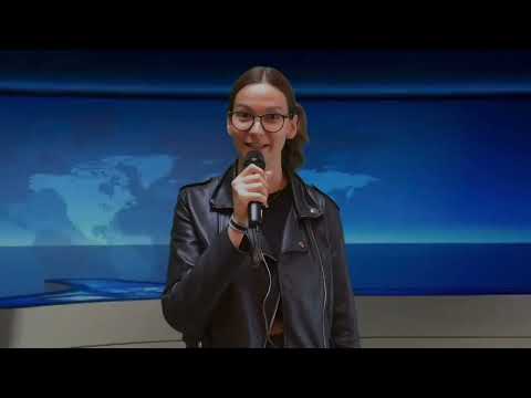 Eine Schülerin steht vor einem Greenscreen und wird mit einem Mikrofon in der Hand von einer Mitschülerin gefilmt.