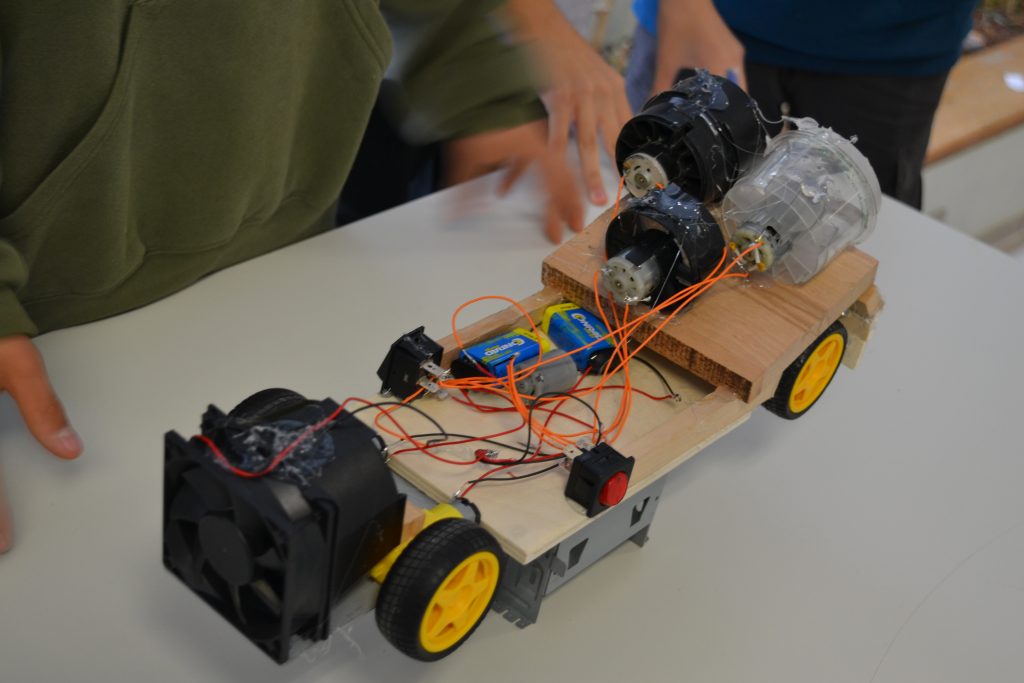 Gemeinsamen wurde dann noch aufgeräumt und Müll getrennt, denn schon bald sollten sich die sieben Roboter bei der Abschlussveranstaltung präsentieren. Im Foyer war der richtige Platz dafür. Und alle funktionierten! Einige rasten mit Vollgas los. In anderen waren Ventilatoren oder LEDs integriert, alle mit Ein-/Ausschaltern versehen. Eine Gruppe hat es sogar geschafft, sechs unterschiedliche Funktionen einzubauen. Am Ende waren alle Schüler*innen happy, dass sie ein tolles Ergebnis vorweisen konnten. Und auch die Lehrkräfte waren begeistert und erstaunt, wie toll das Projekt von den Kindern und Jugendlichen angenommen wurde.