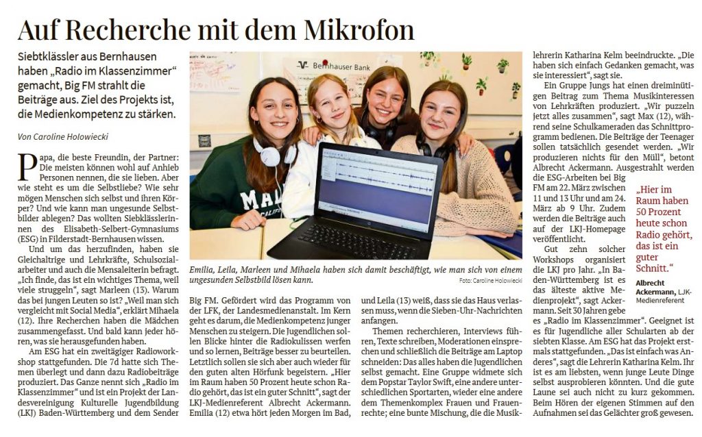 Das erste „Radio im Klassenzimmer“-Medienprojekt des Jahres fand am Elisabeth-Selbert-Gymnasium in Filderstadt statt. Die Gruppe war sehr motiviert und kannte sich mit vielen Facetten des Radios aus, was den Workshop in seiner Gesamtheit noch produktiver und für alle Beteiligen gewinnbringender machte. Der Grund dafür war, dass viele von ihnen auch privat Radio hören und darüber hinaus ein wenig Erfahrung mit der Audioschnitt-App Audacity hatten. Dies kam wiederum allen zugute und trug dazu bei, dass der Bearbeitungsprozess reibungsloser verlief. Auch die Reporterin der Stuttgarter Nachrichten, die das Projekt besuchte, war von der Produktivität und tiefe der Themenauswahl der Jugendlichen sichtlich beeindruckt