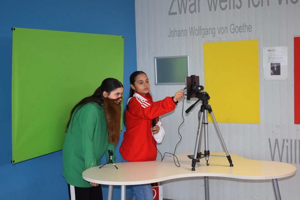 Die wichtigsten Punkte wurden zu Beginn des zweiten Tages noch einmal abgefragt, woraufhin die Gruppen starten konnten. Für die Dreharbeiten verteilten sich alle im Schulhaus. Eine Gruppe entschied sich für eine Smoothie-Challenge. Andere backten Waffeln in der Küche. Zwei Mädchen zeigten, wie man kleine Faltkartons bastelt. Es gab sogar eine Grusel-Roomtour, durchgeführt von zwei Einbrecherinnen mit Sturm-hauben. Das Besondere an einer weiteren Roomtour-Gruppe war, dass sie ihre Aufnahmen sowohl in ukrainischer als auch in deutscher Sprache während dem Filmen kommentierten. Auch eine „True Crime“-Kurzgeschichte wurde gedreht. Die einzige Jungs-Gruppe unter lauter Mädchen stellten in einer Art Hitliste auf sehr unterhaltsame Weise beliebte Schulpranks vor. Zum Abschluss des zweiten Tages wurde noch über das Urheberrecht, Persönlichkeitsrechte und das Recht auf geistiges Eigentum geredet.