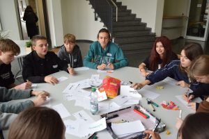 die teilnehmenden bearbeiten um einen tisch gemeinsam den Projektstrukturplan