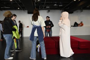 Abschließend und auch als kleine Entlohnung nach der Anstrengung bekamen die Teilnehmenden einen Theaterworkshop der Theaterpädagoginnen am JES. Innerhalb kürzester Zeit bewegten sich die Jugendlichen sicher im Raum, stellten ihre Präsenz wie Kreativität unter Beweis und hatten sichtlich viel Spaß am Improvisieren kleiner Szenen.
