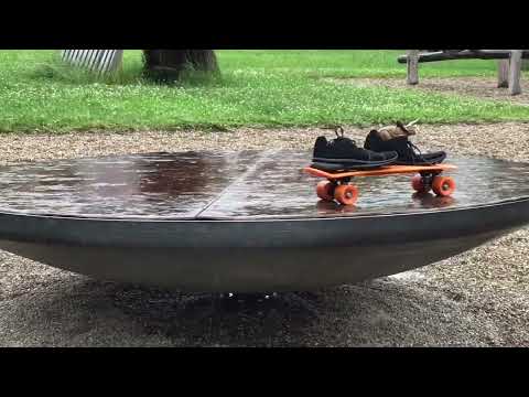 Es ist ein Skateboard zu sehen mit zwei Schuhen darauf, daneben steht auf dem Boden ein Spielzeug-Dino (Triceratops).