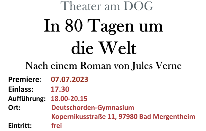Die Kulturstarter*innen Ronja und Fabian initiierten im Schuljahr 22/23 die Gründung einer AG, „Theater am DOG“. Gemeinsam sollte „In 80 Tagen um die Welt“ nach dem Roman von Jules Verne auf die Bühne gebracht werden. Schnell schlossen sich über 20 Mitschüler*innen an und probten und gestalteten gemeinsam die Umsetzung der Geschichte. Bei dieser geht es… weiterlesen »