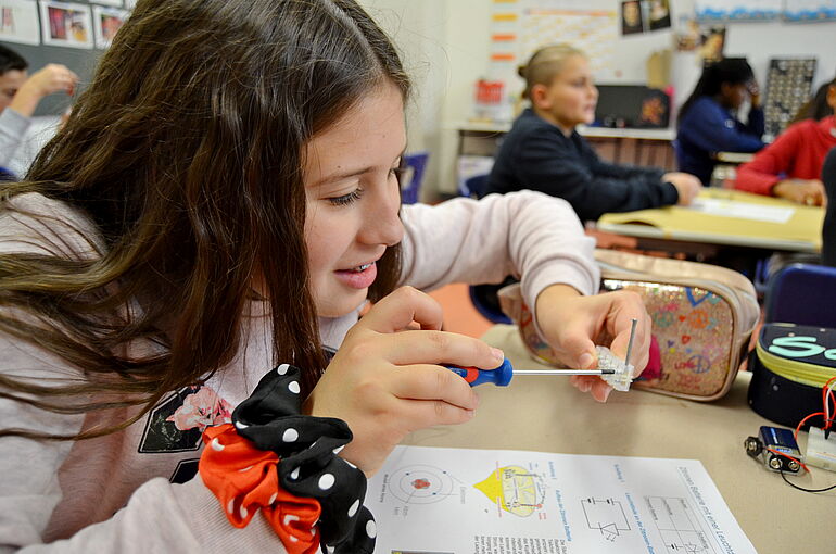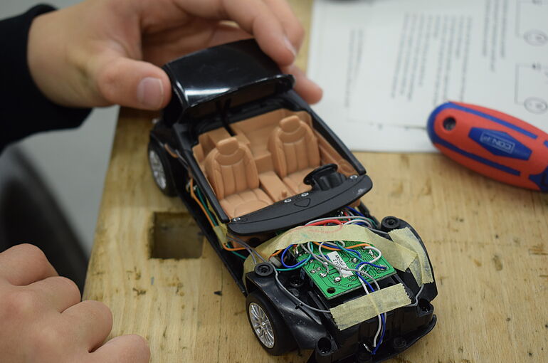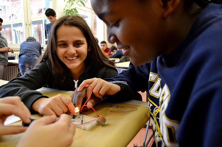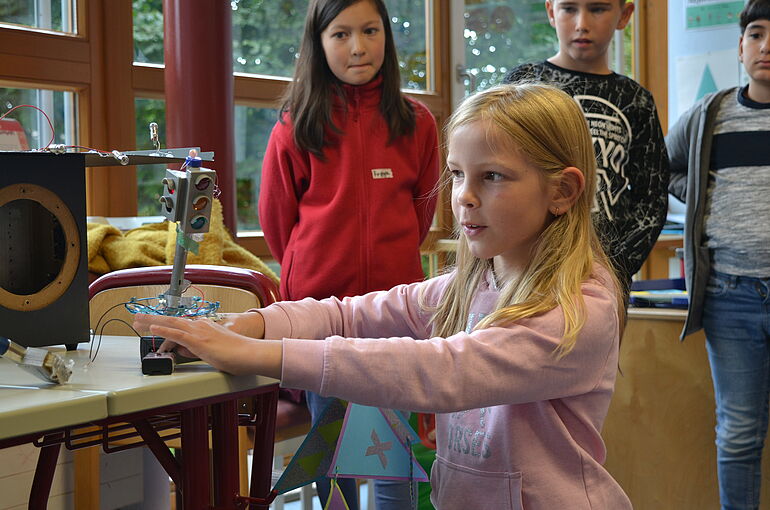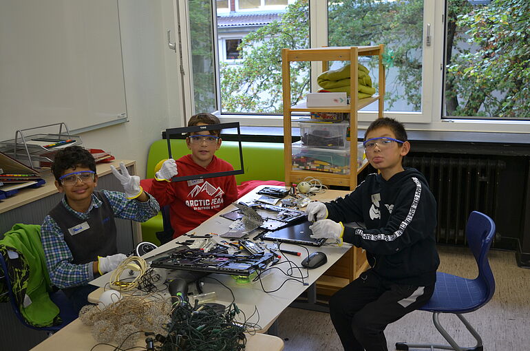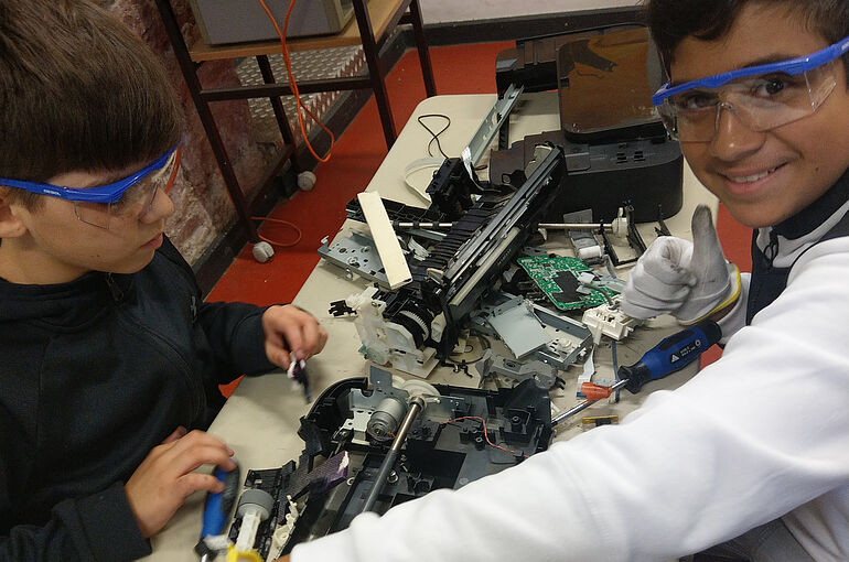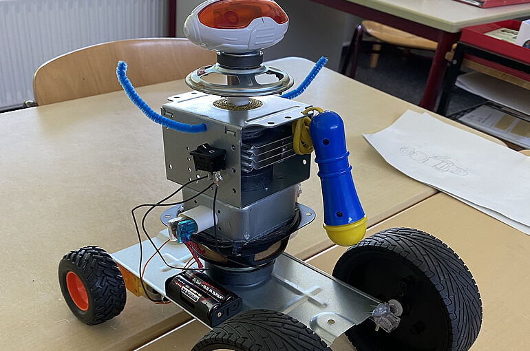 Dazu nutzen sie u. a. Elektroschrott, LEDs, kleine Motoren, Stifte, Farbe und Pappe. Profis aus den Bereichen Elektrotechnik, Medien und Kunst unterstützen die Schüler*innen dabei. Die produzierten Making-Kunstwerke spiegeln die persönlichen Stärken der Teilnehmenden wider, offenbaren Talente und machen Mut sich weiter mit dem Thema zu beschäftigen.