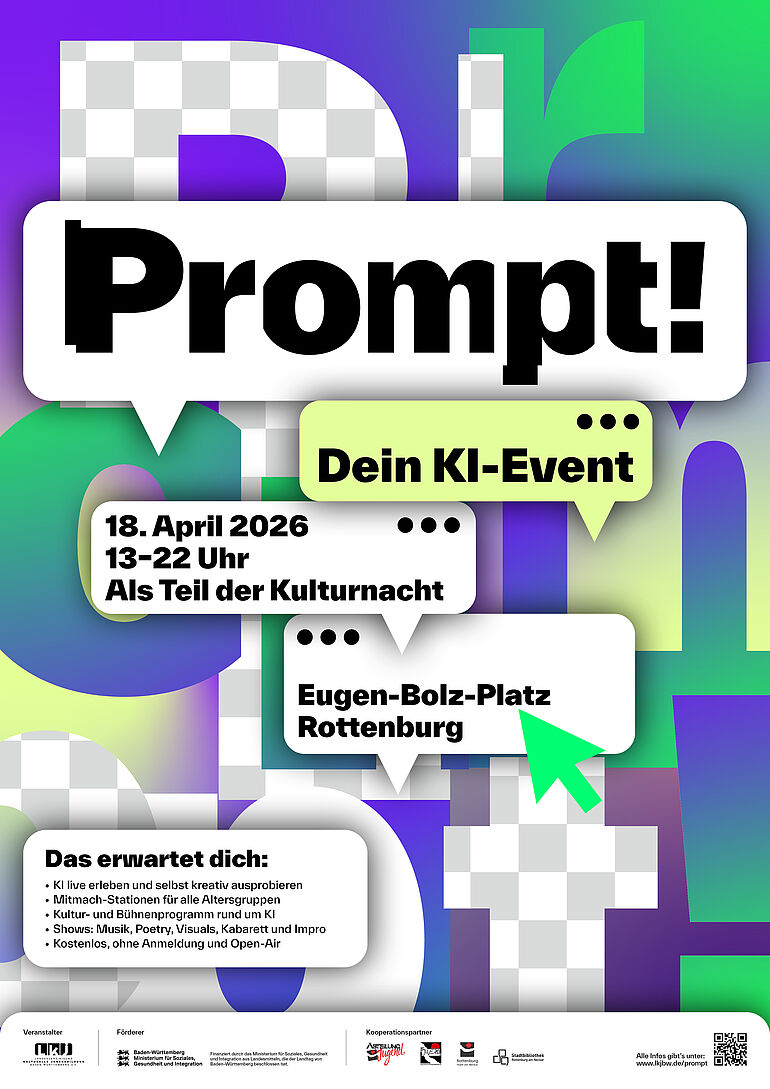 Künstliche Intelligenz ist längst Teil unseres Alltags – doch wie funktioniert sie eigentlich und was kann man kreativ mit ihr machen? Das zeigt „Prompt! Dein KI-Event“. Das eintägige, kostenfreie Festival „Prompt! Dein KI-Event“ bietet interaktive Mitmach-Stationen und ein kulturelles Bühnenprogramm für alle Altersgruppen rund um das Thema KI. Vor dem Festivaltag gibt es außerdem mehrere Workshops für Jugendliche und junge Erwachsene. „Prompt!“ findet 2026 in sechs Städten in Baden-Württemberg statt.